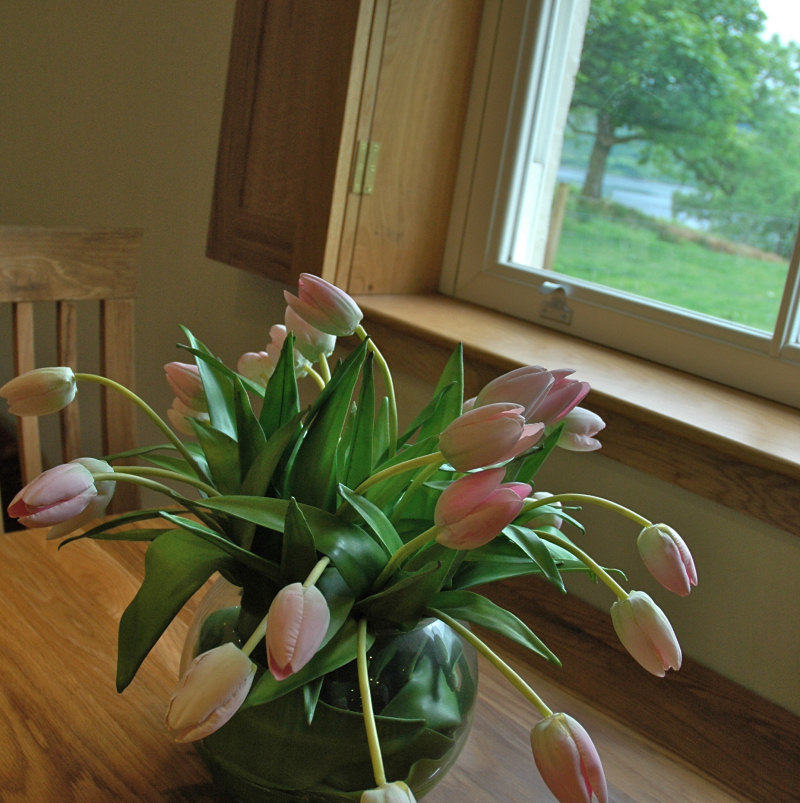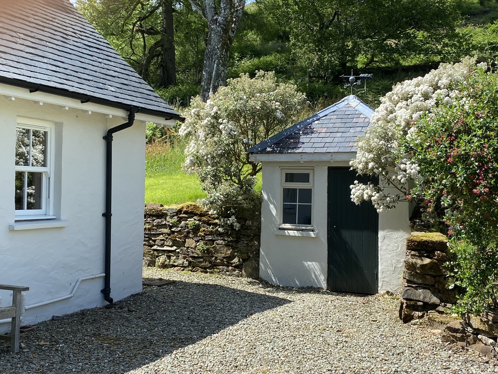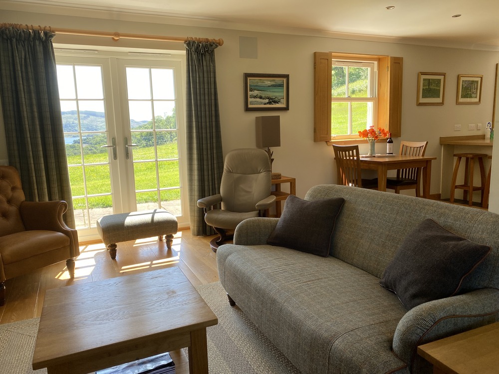 DOWNSTAIRS is one open-plan oak-floored space: a snug sitting-area with a wood burner, a dining area and a well equipped kitchen. Also a downstairs WC and a utility room with washing machine and tumble dryer and plenty of space for wellington boots and hanging coats. In the winter, the wood burner and underfloor heating keep the cottage lovely and warm; in the summer, French doors open out onto a sheltered sun-trap of a garden with a terraced patio, BBQ area, garden furniture and that wonderful hard to beat vista across rolling green fields sloping down towards Loch Melfort and beyond.